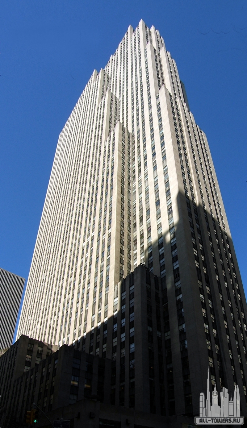 Небоскрёб в стиле ар-деко в Мидтауне Манхэттена. Здание является центральным объектом Рокфеллеровского центра. До 1988 года небоскрёб назывался Ар-Си-Эй-Билдинг. С 1988 по 2015 год — GE Building. В здании расположена штаб-квартира компании NBC Universal. Архитектурный проект здания был завершён в апреле 1931 года. Строительные работы на месте здания начались в июле 1931 года. Сам же небоскрёб возводился в 1932—1933 годах по проекту архитектора Реймонда Худа. Во время строительства фотограф Чарльз Эббетс сделал снимок «Обед на небоскрёбе», принёсший ему мировую известность. В 1985 году городская комиссия наделила небоскрёб статусом достопримечательности Нью-Йорка. В 1976 году журнал Американского института архитекторов включил Ар-Си-Эй-Билдинг в список лучших офисных зданий США. В 1986 году корпорация General Electric перекупила компанию RCA, и в 1988 году здание получило своё нынешнее название. Ныне в здании производятся съёмки таких передач NBC, как Nightly News, Dateline и Saturday Night Live. Небоскрёб строился с учётом требований заказчика. Так, для улучшения звукоизоляции вещательные помещения были изолированы от несущих элементов конструкции. Для этого при строительстве использовались стальные зажимы, обитые войлоком. Лифты, рассчитанные в общей сложности на 58 пассажиров, были размещены в центральной части строения. На подземных этажах небоскрёба находятся магазины и бутики. За свою характерную форму здание получило прозвище «плита». Над главным входом в здание расположен фриз авторства выдающегося американского скульптора Ли Лори. На нём приведена цитата из Книги пророка Исаии: настанут безопасные времена твои, изобилие спасения, мудрости и ведения. Примечательно, что весной 1933 года мексиканский муралист Диего Ривера на фреске «Человек на распутье» в главном вестибюле разместил изображение Владимира Ленина и парада, посвящённого 1 мая. Под давлением общественного мнения Джон Рокфеллер попросил Риверу убрать этот образ или хотя бы изобразить на противоположной стороне вестибюля Авраама Линкольна, на что получил отказ. Ривера был отстранён от работ, фреска была задрапирована, а в феврале 1934 года и вовсе разрушена рабочими. Вместо неё была создана новая фреска, на которой среди прочих были изображены Линкольн и Ральф Эмерсон.